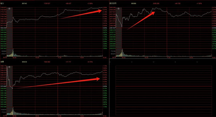 日内题材强的是电力、稳定币、消费, 基本是周末发酵的东西,按强度看的话,电力、稳定币发酵了半天,消费勉强算得上全天。