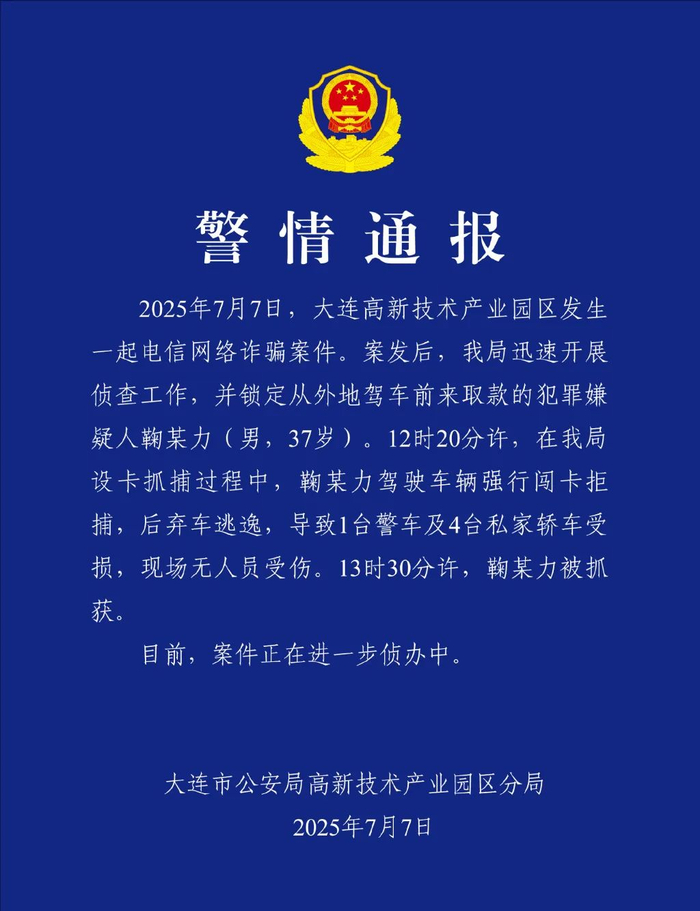 2025年7月7日,大连高新技术产业园区发生一起电信网络诈骗案件。案发后,我局迅速开展侦查工作,并锁定从外地驾车前来取款的犯罪嫌疑人鞠某力(男,37岁)。12时20分许,在我局设卡抓捕过程中,鞠某力驾驶车辆强行闯卡拒捕,后弃车逃逸,导致1台警车及4台私家轿车受损,现场无人员受伤。13时30分许,鞠某力被抓获。