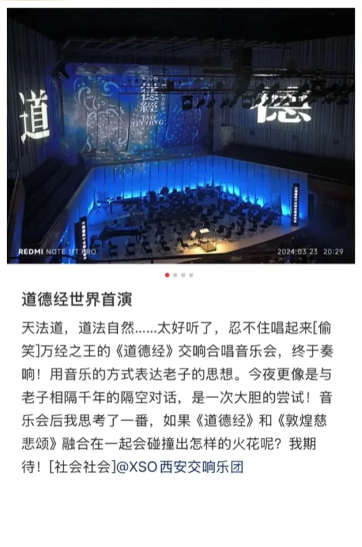 2024年3月23日,大型交响合唱《道德经》在西安音乐厅首演成功,西安交响乐团、西安交响乐团合唱团带领观众致敬伟大的东方智慧,“中华文化之源”以声共鸣,在社交媒体平台也收获了诸多好评。