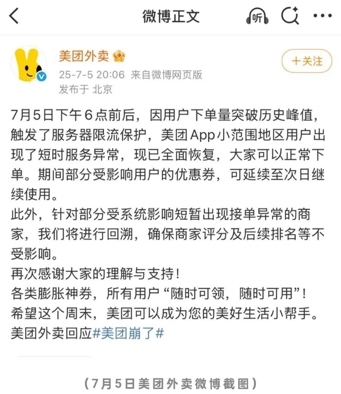 因为7月5日当天的活动过于火爆,以及活动的内容通过短视频等平台持续发酵,大量新老用户不断涌入两家平台“薅羊毛”。并且由于短期内订单数量过多,美团甚至一度出现APP服务异常情况。