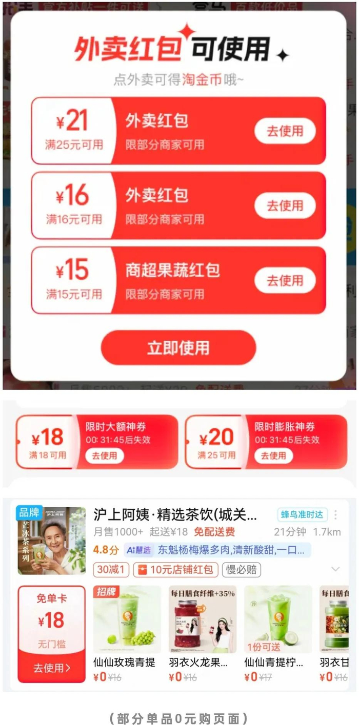 从市面上的情报来看,这一轮阿里与美团的补贴,可以算的上是拳拳到肉。7月5日,不少用户惊喜地发现,淘宝闪购和美团外卖,同时都出现了这么多年以来再也没见过的“巨额”红包。甚至因为红包金额巨大的原因,不少单品甚至出现了“0元购”的情况。