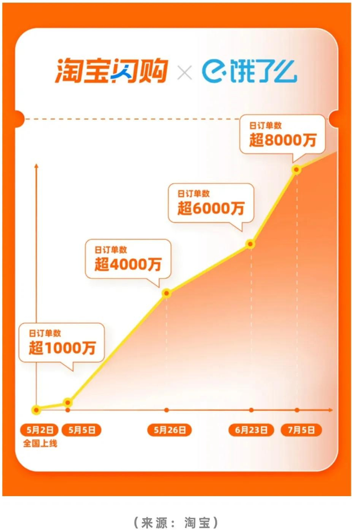 5月2日淘宝正式推出“闪购”频道,相当于把饿了么搬进淘宝这个超级APP中,并且获得前所未有的流量大支持。闪购仅上线三天后的5月5日就突破1000万单,随后在5月26日突破4000万单,再到7月5日突破8000万单。仅从订单数量的角度来看,已经初步能与美团分庭抗礼。