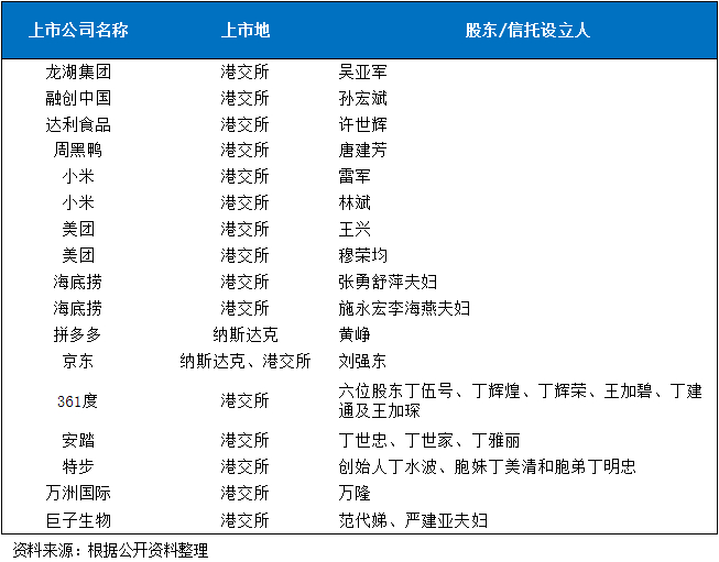 我们耳熟能详的刘强东、马云、雷军、王兴、黄峥等中国科技巨头创始人都各自通过设立的海外家族信托(离岸家族信托)持有他们创立的港美股上市公司京东、阿里巴巴、小米、美团、拼多多的股份;