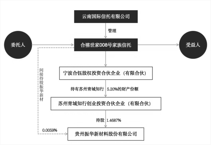 云南国际信托有限公司,持有振华新材0.0059%的股权,属于振华新材的第三层股东。