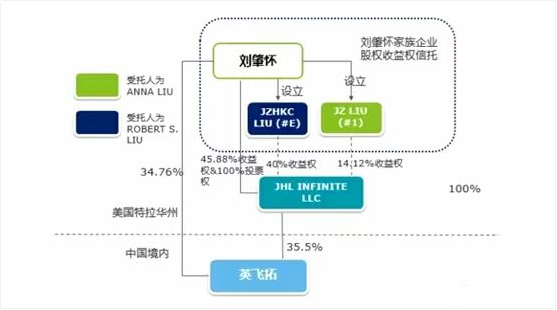 刘肇怀通过将自己100%控制的JHL INFINITE LLC公司的54.12%的股权装入设立的JZLIU(#1)(以下简称“#1家族信托”)、JZHKC LIU(#E)(以下简称“#E家族信托”)两个信托中,实现家族信托间接持股A股上市公司英飞拓。