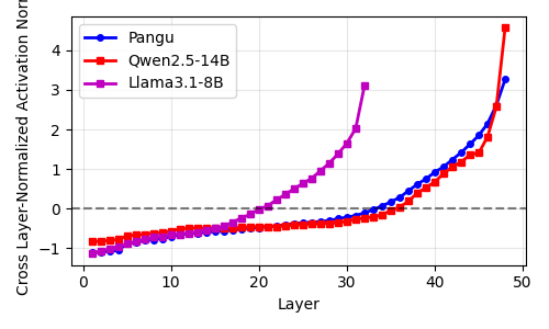 除此之外,团队正在研究每一层的激活值大小。为此,HonestAGI从The Pile测试集中随机抽取了1000个批次的样本(https://pile.eleuther.ai/),并计算了每层的激活范数,同时采用了统一的归一化方法。每个批次包含8条序列,长度为1024。目前初步结果已经公布,显示盘古模型和文心模型的表现依然相似,说明它们在计算方式上有很大的相似之处。