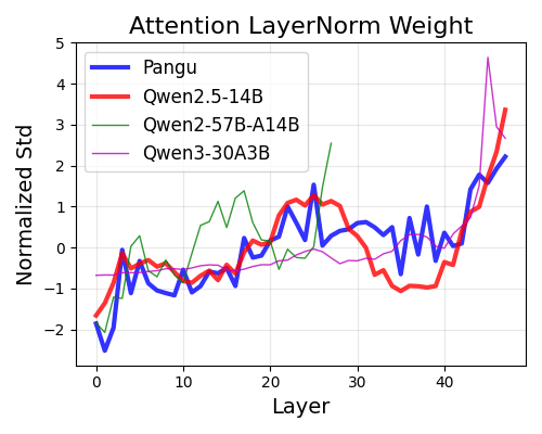 对注意力层的归一化权重进行分析后,进一步印证了它们之间的相似性。盘古和Qwen2.5-14B在各层的表现趋势非常一致,呈现出类似的初始化方式和收敛过程,这也让它们在行为上明显区别于像Qwen2-57B-A14B和Qwen3-30A3B这样的其他模型。