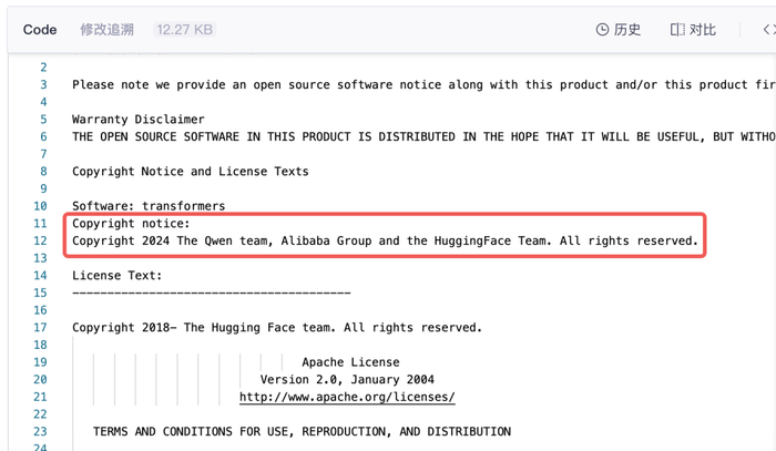 除此之外,HonestAGI还发现盘古大模型官方在GitCode中发布的代码中,还异常地包含了Qwen 2024的许可证。其意在指出,盘古大模型团队所用到的“transformers”组件的版权归属于Qwen团队、阿里巴巴集团和HuggingFace团队。