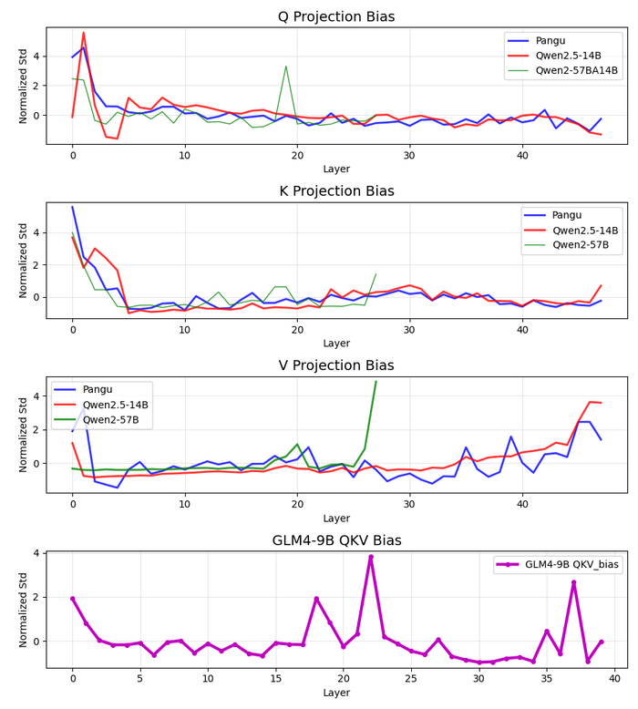 从结果来看,Pangu与Qwen2.5-14B的Q、K、V投影偏差模式几乎相同,早期层出现特征性峰值后收敛,而这个设计是Qwen 1-2.5代独有的特色,多数开源模型(包括Qwen3)已弃用。