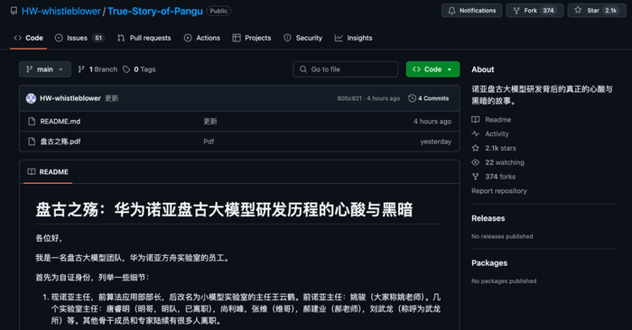 就在昨天,一篇名为《盘古之殇:华为诺亚盘古大模型研发历程的心酸与黑暗》的文章在GitHub上走红,仅一天时间便揽获2.5K Star(还在持续增长中)。