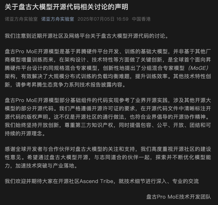 对于这次抄袭风波,涉事的“主角”盘古Pro MoE背后的团队也在第一时间站出来发出了声明做回应。强调了他们是全球首个面向昇腾硬件平台设计的同规格混合专家模型,创新性地提出了分组混合专家模型(MoGE)架构;并且部分基础组件的代码实现参考了业界开源实践,涉及其他开源大模型的部分开源代码,是严格遵循开源许可证的要求。