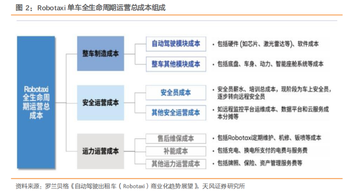还有维修保养、零部件更换等维护成本,每年约需5万元/车的投入,且未来也很难有显著下降;安全冗余则是Robotaxi配备安全员的人力成本,每年大约在3-10万元/车之间;平台运营成本主要包含平台端的软件升级及界面优化等支出,目前每年约为3万元/车。