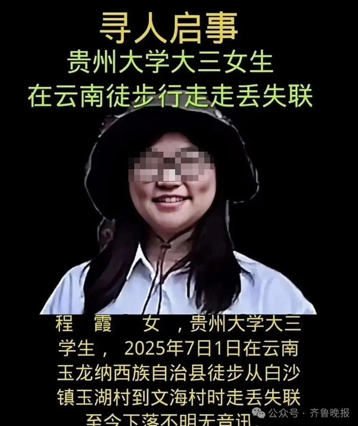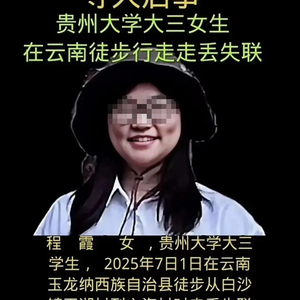 7月1日,贵州20岁女大学生程霞在云南丽江玉龙纳西族自治县白沙镇玉湖村附近失联。连日来程霞姐姐多次通过短视频平台向网友求助。