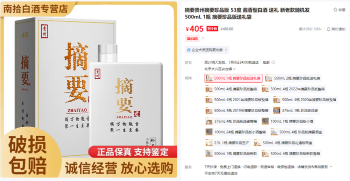以旗舰产品53度摘要珍品为例,2021年官方零售指导价1199元/瓶。而截至2025年7月6,京东平台显示,53度500mL一瓶装摘要珍品售价仅405元。