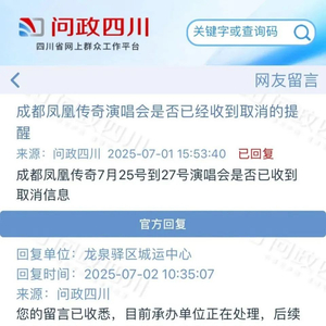 近日,网上有传言称“凤凰传奇7月成都站演唱会将取消”。有网友在“问政四川”平台留言咨询相关问题“成都凤凰传奇7月25号到27号演唱会是否已收到取消信息”。对此,龙泉驿区城运中心回复称:我局已收到您来信中提到的凤凰传奇演唱会演出举办方取消“凤凰传奇「吉祥如意」2025巡回演唱会-成都站”的申请。