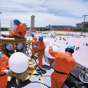 照明管理中心华灯班正在天安门广场开展华灯清扫检修作业。