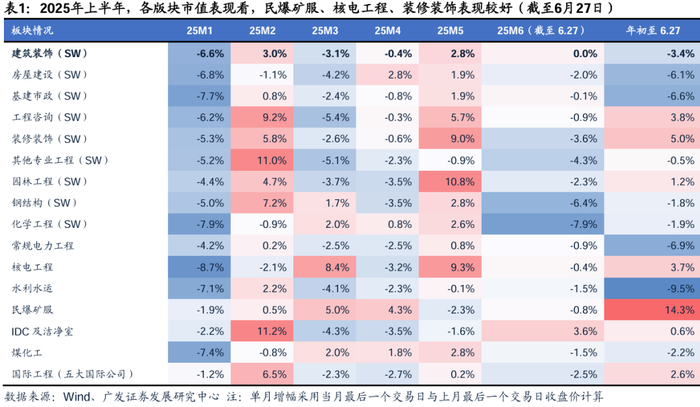 专业工程各细分领域看:重大事件驱动叠加需求改善预期强,市场表现好于基建房建工程。根据iFinD,25M1-5,采矿业固投同比增速先增后降,化学原料及制品制造业固投同比呈下滑趋势。煤化工:上半年新疆一系列煤化工项目落地,新疆煤化工步入高速建设期,25Q2煤化工工程领域市场关注度逐步回暖。民爆矿服工程:2月《加快推进民用爆炸物品行业转型升级实施意见》要求行业提升集中度和智能化转型,新疆煤化工建设提速催化疆煤矿服增量需求,供给受限/需求增长/集中度提高的民爆矿服竞争格局进一步强化。基本面强于传统建筑行业叠加三峡水运新通道招标等重大项目进展事件催化下,民爆矿服领域表现由于建筑行业整体。IDC工程及洁净室:1月,美国发布《人工智能扩散规则》推动国产替代需求增长,IDC工程及洁净室工程市场关注度显著提升,2月,阿里巴巴等公司宣布AI及云基础设施大规模投资计划后市场热度进一步攀升,4-5月,市场情绪有所消退,6月下旬,算力板块及信创板块带动IDC及洁净室工程再次走强。国际工程板块:主要受俄乌谈判及伊以冲突事件影响,相对市场表现先升后降。