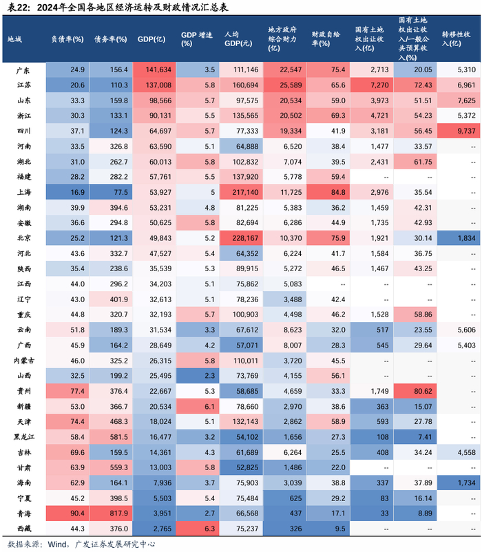 财政端,关注自身财政实力强及中央支持力度大区位,资金端更有保障。经济基础好:传统长三角、京津冀、粤港澳等以上海/江苏/浙江/北京/广东为代表省份,经济基础好,财政自给率高,根据Wind,分别达84.8%/65.6%/69.3%/75.9%/75.4%,地方政府综合财力较强、负债率位于国内较低水平,地方政府资本开支能力相对较高;中央支持力度大:以四川为代表,根据Wind,省内财政自给率41.9%,处于国内中游水平,财政收入中转移性收入绝对金额及占比高,2024年,四川省转移性收入达9737亿元,居国内首位,政策支持力度大,除此以外,山东、云南及广西财政自给率低于60%,分别达59.0%/32.0%/28.3%,转移性收入分别达7625/5606/5403亿元。