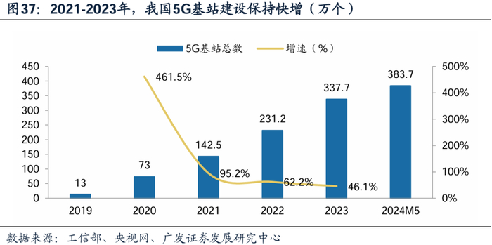 通信升级需求叠加政策规划带动5G基站覆盖提速。根据《“十四五”信息通信行业发展规划》,“十四五”时期力争建成全球规模最大的5G独立组网网络,力争每万人拥有5G基站数达到26个,实现城市和乡镇全面覆盖、行政村基本覆盖、重点应用场景深度覆盖,其中行政村5G通达率预计达到80%。根据通信产业网,2022-2023年,5G开支总额分别为1580亿元和1415亿元,分别占当年资本开支总额44.9%和39.4%。