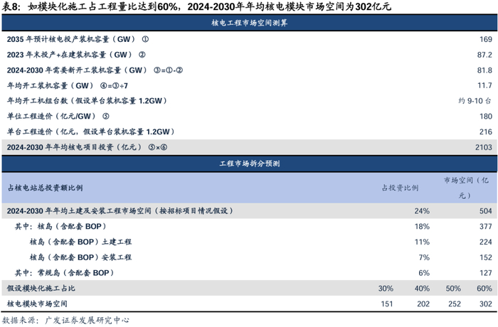 核电建设提速背景下,模块化建设应用渗透率有望提升。核电模块化建设指在工厂预制的大型核电厂组件,通过标准化设计制造后运至现场组装的技术体系。模块化技术具有工期缩短、安全可靠、易于维护三大优势,建设提速背景下,模块化技术有望进一步普及。如模块化施工占工程量比达到60%,对应年均核电模块市场空间为302亿元。根据广发建筑团队发布的中国核建深度报告,我们测算2024-2030年核电年均土建及安装市场空间达504亿元(对应每年9-10台核电机组开工),如模块化施工占工程量比达到30%/40%/50%/60%,对应每年核电模块市场空间为151/202/252/302亿元。
