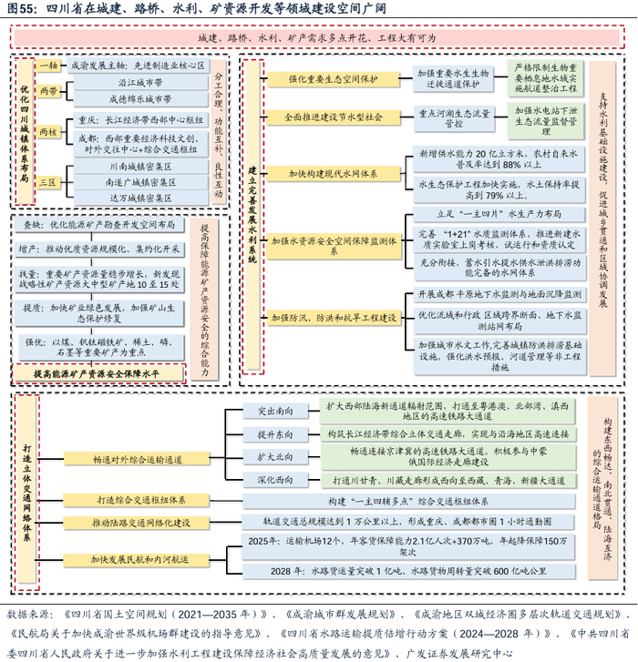 有建设空间:省内建设需求潜力深厚,成渝城市群规划等重大战略拓宽发展空间。基本需求方面,《四川省国土空间规划(2021—2035年)》明确评定四川省“承载能力较强、空间潜力较大”。政策刺激方面,成渝地区双城经济圈建设、高质量共建“一带一路”、长江经济带发展、新时代西部大开发、黄河流域生态保护和高质量发展等国家级战略在川叠加,拓宽城市建设空间,为进行城市建设提供历史机遇。根据四川省“十四五”相关规划,①交通建设:四川省“十四五”规划完成交通投资1.2万亿元,截至23年,仍有高速公路1194公里、铁路投资952.5亿元待完成;②水资源开发:“十四五”规划水利投资额2000亿元,同比+52.0%;根据23-35年规划,高等级航道建设合计2288公里;“十四五”规划水电建设1.1亿千瓦,同比+29.9%。③矿业开采:根据中新网,预计24-25年,四川11个市县自愿出资1.6亿元实施找矿项目;设立50亿元资源能源基金,预计基金集群规模可达130亿元。④能源开发:23M12,25家央企、科研院所、高校等在四川成都正式宣布成立可控核聚变创新联合体。2023年,成都氢能全产业链实现产值130亿元,同比+10%;24-26年成都市氢能产业链总投资有望超170亿元。
