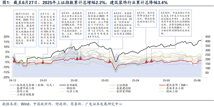 总体看,建筑行业上半年指数显著弱于大盘。根据Wind,截至6月27日,2025年上证指数累计总增幅2.2%,建筑装饰行业累计总降幅3.4%,跑输上证指数5.6pct。海外压力加剧,2月以来,中美贸易摩擦不断,在5月经贸会谈有所缓和,为应对外部压力、解决国内问题,中央政府上调赤字率。3月5日,政府工作报告提出2025年赤字率拟按4%左右安排,比上年提高1个百分点;拟发行超长期特别国债1.3万亿元、地方政府专项债券4.4万亿元。24M9化债政策落地后,大型建筑企业报表修复未及市场预期,故使得权重股持续阴跌导致建筑指数不及预期。