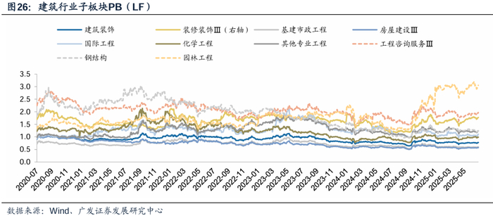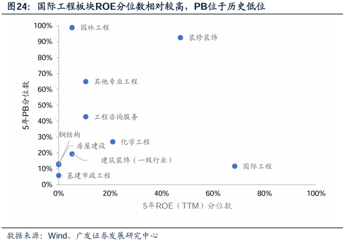 ROE、PB趋势看:根据广发策略组外发的PB-ROE方法论专题报告,PB-ROE投资为买入PB较低、ROE较高且稳定的资产,等待价值发现或时间价值的兑现。从SW建筑装饰子版块看,基建、房建、钢结构板块虽PB分位数较低,但ROE处于持续下降趋势。国际工程ROE呈现提升趋势、化学工程ROE保持较高水平,且估值分位数较低,具有较高投资价值。