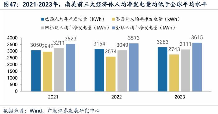 拉美地区长期以来在基础设施建设方面存在较大缺口,交通、能源等基础设施陈旧落后,难以满足经济社会发展需求。据世界银行,该地区约30%的人口无法享受到稳定的电力供应,公路、铁路等交通网络覆盖率低且老化严重。根据Wind,2023年,拉美前三大经济体巴西、墨西哥、阿根廷人均净发电量为3283、2743、3111kWh,均低于全球平均水平。