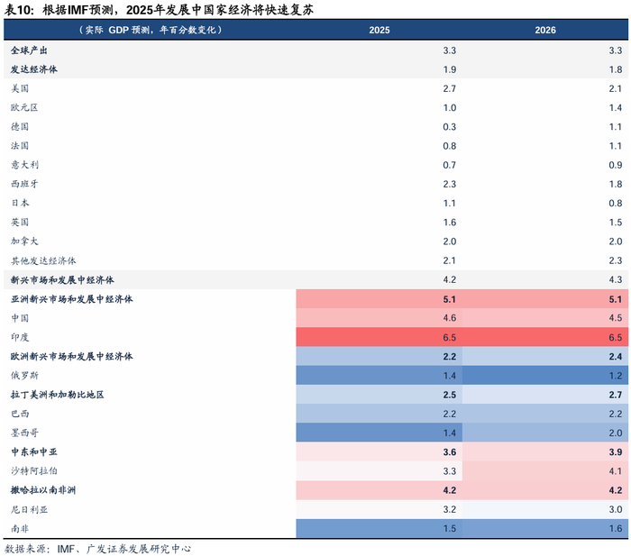 发展中国家经济快速复苏,产业链建设需求孕育机会。根据IMF《世界经济展望》,2025-2026年预计经济增速稳定在3.3%(2024年增速估计值为3.2%),各区域情况分化。预计新兴市场和发展中经济体2025年增速为4.2%,高于世界平均水平3.3%。其中中国、印度2025年预计增速分别为4.6%、6.5%,带动亚洲新兴和发展中经济体增长。