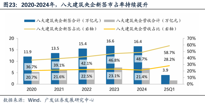 财务、市值双重考核“指挥棒”下,建筑央企严抓现金流、提升现汇项目占比,推动存量低效无效资产出清,估值有望逐步修复,市场总量下滑背景下“强者恒强”行业趋势或持续。根据Wind,2020-2024年,八大央企新签合同总额从11.9万亿元上升至16.4万亿元,占建筑业总新签合同额的比重从36.7%上升至48.7%。
