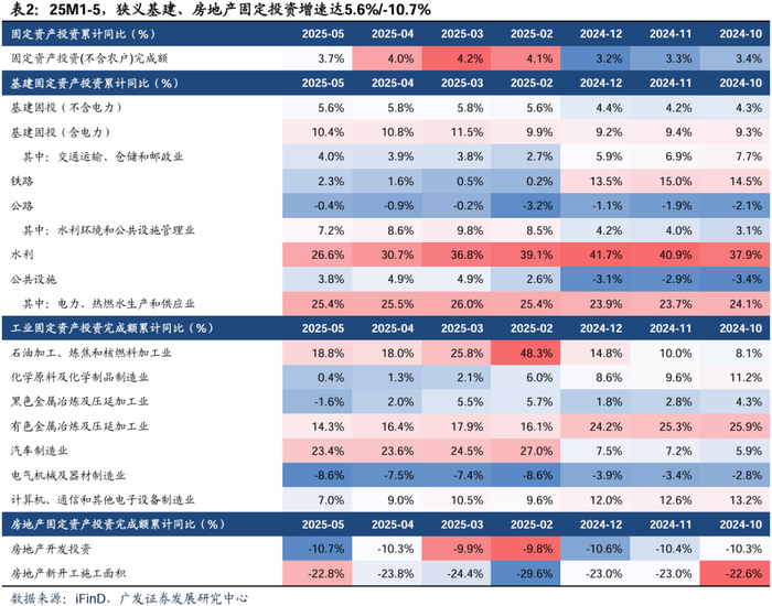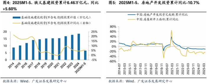 固定资产投资总体偏弱,基建投资增速逐月放缓,地产投资维持低位。根据iFinD,25M1-5,全国固定资产投资同比+3.7%,增速连续两月环比下降,拆分看,狭义基建投资累计同比+5.60%,增速较前4月下降0.2pct,较2024年同期下降0.1pct,增速有所放缓。2025M1-5,地产开发投资累计3.62万亿元,同比-10.7%,增速较前4月下降0.4pct,较2024年同期下降0.6pct;房屋新开发面积累计2.32万平方米,同比-22.8%,增速较前4月下降1.0pct,较2024年同期下降1.4pct,地产投资总体呈现低基数、持续下滑趋势,当前地产销售持续低迷,居民加杠杆意愿薄弱引发有效需求显著不足。