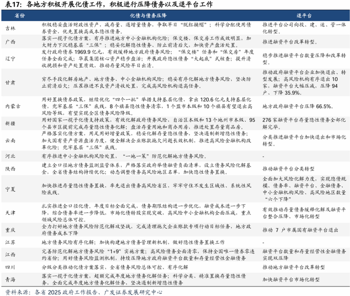 地方看,各地方政府积极开展隐债处置工作。各省份在2025年政府工作报告中,围绕化解地方政府债务风险(化债与债务压降)和推动融资平台退出转型(退平台)积极开展工作。化债方面,各个地方核心聚焦于“压降存量、严控增量、优化结构、降低成本”,各地2025年工作强调“不新增隐性债务”为铁律,同时加速债务置换、平台退出和资产盘活。部分区域对于隐债压降规模以及退平台都给出相关定性或者定量规划,伴随化债资金到位,地方政府财政或边际好转。