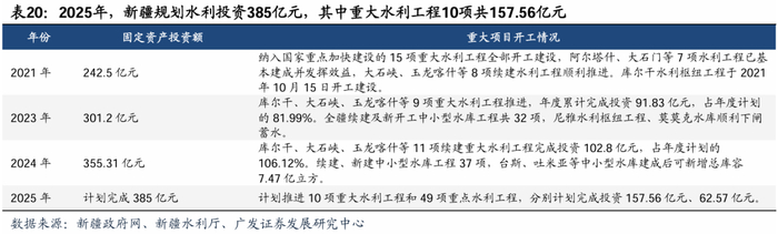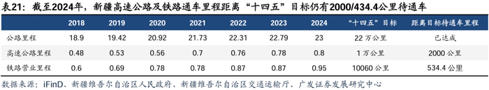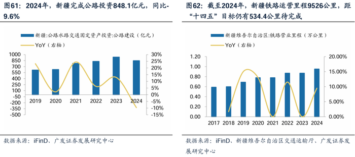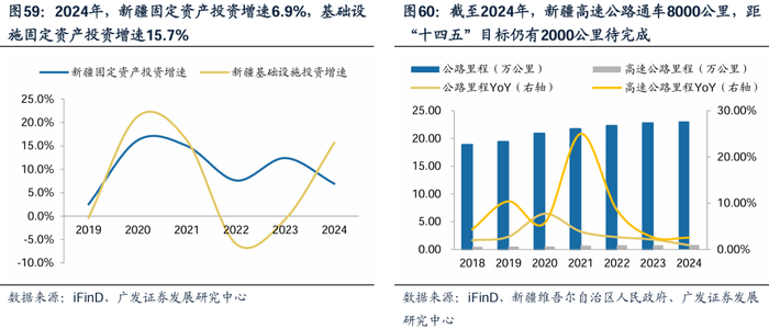 “一带一路”倡议和西部大开发战略驱动,基础设施投资稳健增长。总体看,2024年,新疆固定资产投资增速6.9%,基础设施固定资产投资增速15.7%,维持较快增长。细分领域看,公路方面,根据iFinD,2022年以来,新疆公路建设投资规模均超800亿水平,其中2023年增长较快完成公路投资938.7亿元,同比+13.0%,2024年完成公路投资848.1亿元,同比-9.6%。根据新疆“十四五”规划,高速(一级)公路超1万公里,截至2024年新疆高速公路通车8000公里,仍有2000公里待完成,建设空间广阔;铁路方面,截至2024年,新疆铁路运营里程9526公里,“十四五”规划铁路运营里程不足1万公里,仍有534.4公里待完成,当前,中吉乌铁路等跨境项目开工,带动新疆铁路投资进一步提升;水利方面,2023年新疆完成水利投资301.2亿元,同比+18%,增速为2018-2023年最高,截至2024年12月13日,24年累计完成投资355.31亿元,达到年初350亿元目标,新疆水利投资维持高景气。