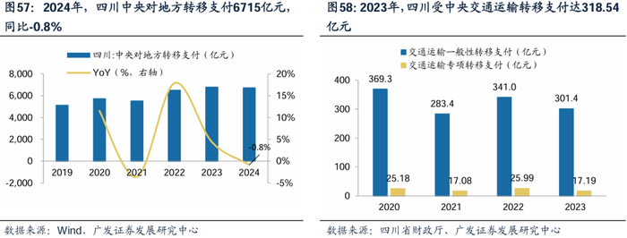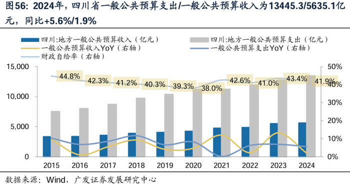有资金:四川省作为中国西南地区重要省份,获得中央政府转移性收入规模较大。收入端,2024年,四川省一般公共预算收入5635亿元,同比+1.9%,2015-2024年,CAGR+5.9%。支出端,2024年,四川省一般公共预算支出13445亿元,2015-2024年,CAGR+6.7%。财政自给率水平看,2024年四川省财政自给率41.91%,同比 -1.5pct。根据《关于四川省2024年省级决算的报告》及Wind,2024年,四川省获得上级补助收入6715亿元。交通领域获得转移支付情况看,2023年四川省交通运输领域获得补助318.54亿元。