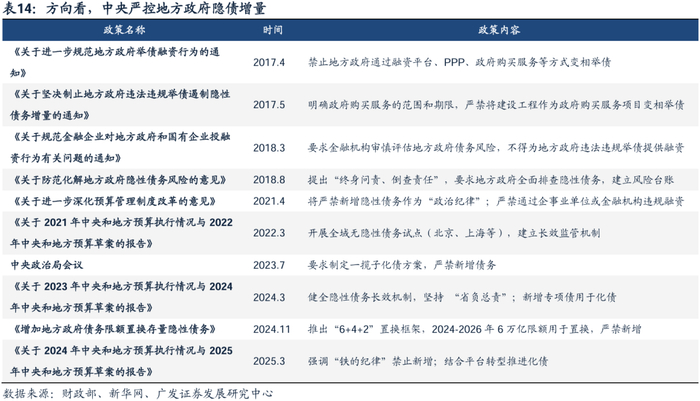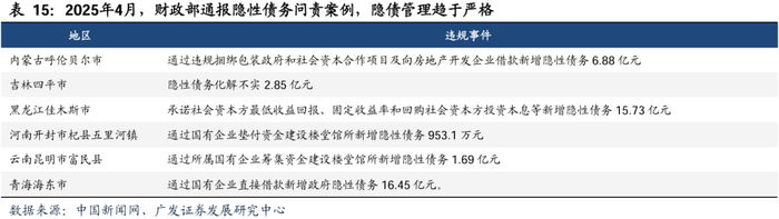 遏制隐性债务增量,加大对地方资金管控力度,中央化债决心坚定。债务管控层面,中央近年持续强化地方债务管控,核心在于遏制隐性债务增量、化解存量。2017年,财政部两通知严禁变相举债,2018年,《关于防范化解地方政府隐性债务风险的意见》提出“终身问责”。2022年,开展全域无隐性债务试点(北京、上海等),建立长效监管机制。2024年,全国人大常委会推出“6+4+2”置换框架置换存量债。2025年,财政部《2025年预算报告》强调“铁的纪律”禁止新增,要求结合融资平台转型推进化债,健全长效监管机制。中央持续保持“零容忍”高压监管态势,严肃查处新增隐性债务、少报漏报隐性债务和隐性债务化解不实等违法违规行为,2025M4,财政部通报内蒙古等6起问责案例,中央化债决心坚定。