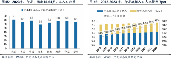 东南亚地区人口结构年轻,拥有庞大的劳动力群体。联合国人口署数据显示,印尼、越南15-64岁劳动年龄人口占比约68%,超过全球平均水平。同时,年轻人口构成活跃消费市场,对住房、商业建筑等需求持续增长。此外,作为活跃新兴经济体,东南亚城镇化进程较快,以印尼为例,2013-2023年,印尼城镇人口增长超3000万人,占比由52%增长至59%,带动大量城市公共设施及住宅建设需求,刺激建筑需求持续放量。