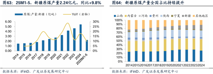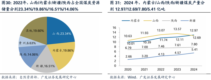 西北地区煤炭储量丰富,新疆煤炭产量快增。储量方面,根据自然资源部,2022年,我国各省份煤炭资源储量中,山西省占比最高,为23.34%,其次为内蒙古19.86%,新疆16.51%,陕西14.06%,贵州6.63%,其他省份合计19.60%;产量方面,内蒙古、山西、陕西和新疆煤炭产量均呈现提升趋势,带动我国煤炭产量整体实现增长。新疆煤炭产量保持快增。根据Wind,2020-2024年新疆产量CAGR+19.4%。