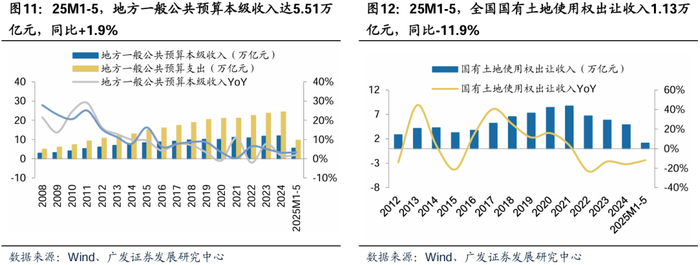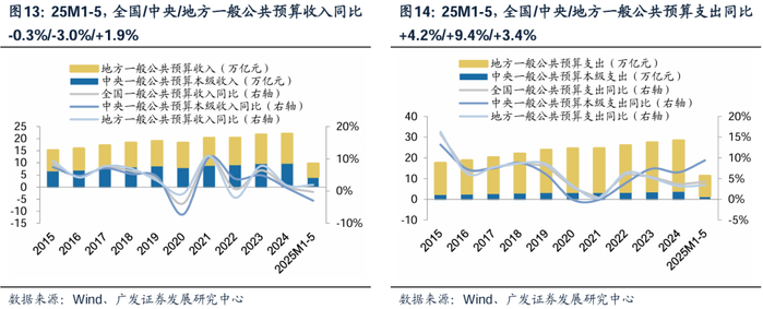 财政支出力度显著强于地方财政,一定程度上对内需形成支撑。对比全国、中央及地方一般公共预算收入及支出情况看,根据Wind,2025M1-5,收入端,全国/中央/地方一般公共预算收入同比-0.3%/-3.0%/+1.9%,中央一般公共预算收入增长弱于地方;支出端,全国/中央/地方一般公共预算支出同比+4.2%/+9.4%/+3.4%,中央发力托底内需,提高赤字率,增发超长期特别国债,扩大专项债投向领域及用作资本金范围;支持“两重”、“两新”,补贴城市更新;扩围实施家电、汽车等消费品以旧换新政策,覆盖品类从“8+N”增至多样化商品;加大社保就业和教育支出,地方财政乏力背景下中央财政积极,托底内需。