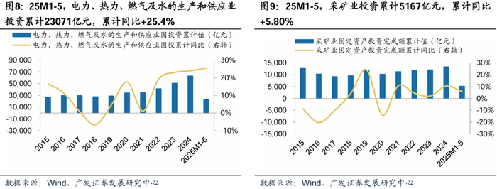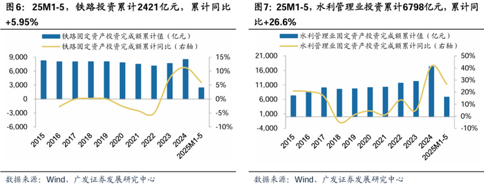 铁路、水利等具备有效需求且获财政支持的领域,因资金保障足、市场需求旺,维持较高景气度;采矿业及核电领域投资或维持高景气。根据Wind,2025M1-5,铁路投资累计2421亿元,累计同比+5.95%,23年2月以来投资维持增长;水利管理业投资累计6798亿元,累计同比+26.6%,24年以来维持较高景气度;电力、热力、燃气及水的生产和供应业投资累计23071亿元,累计同比+25.4%,能源领域投资持续高景气度;采矿业投资累计5167亿元,累计同比+5.80%,25年以来增速虽有下降但保持正向。2024年,全国核准核电机组数达11台;截至25M5,2025年核准核电机组数达10台。预期看,根据中国核电发展中心、国网能源研究院发布的《我国核电发展规划研究》,预计2030年、2035年核电发展规模达131、169GW,发电量占比达到10.0%、13.5%。