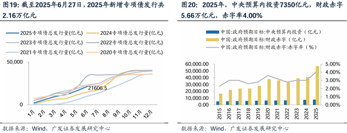前瞻看,中央定调“更加积极的财政政策”,中央财政政策接续及变化为下半年观测重点。预期与执行情况看,2025年,中央进一步提高赤字率及预算内投资,根据Wind,2025年规划赤字5.66万亿元,同比+39.4%;赤字率4%,同比+1.0pct;规划中央预算内投资7350亿元,同比+5%。执行情况看,专项债发行节奏加速,特别再融资专项债发行工作已基本完成,根据Wind,截至6月27日,专项债年内累计发行2.16万亿元, 2025年中央下达地方政府专项债额度4.4万亿元,发行进度已达到49.1%,考虑当前地方财政实际情况以及发行进度,新增专项债发行Q3或继续提速;特殊再融资债发行合计1.80万亿,发行工作接近尾声,后续财政政策接续仍待观察。