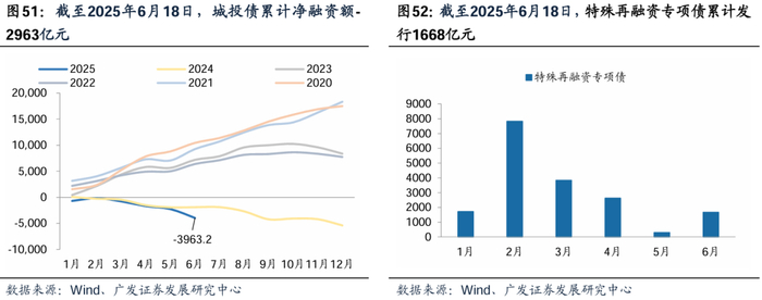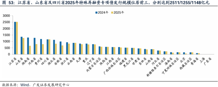 在地方债务管控下,城投债融资收紧,特殊再融资专项债发行分化明显。根据Wind,截至6月18日年内累计情况看,城投债净融资额-2963亿元,严控地方债务背景下城投债融资或持续受限;特殊再融资专项债:累计发行1668亿元,发行节奏较快,已完成全年额度90%的发行工作。各地方通过债务置换,有效缓释地方存量债务风险。其中,江苏省、山东省及四川省2025年特殊再融资专项债发行规模位居前三,分别达到2511/1255/1148亿元,重点省份正通过专项债工具优化债务期限结构,提升财政可持续性,不同省份债务管理策略的差异化特征显著。