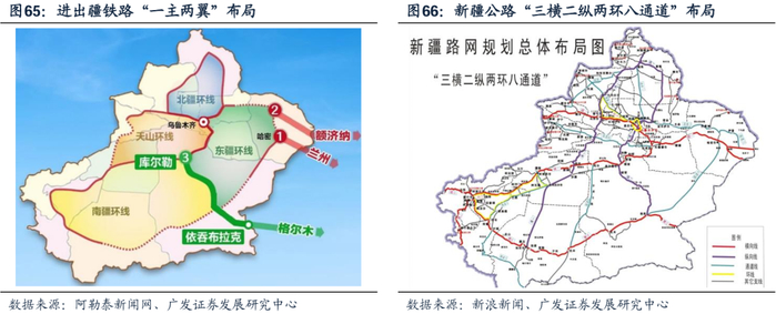 煤炭开采量提升带动基础设施建设市场空间进一步释放。铁路方面,当前新疆铁路进出新疆呈现“一主两翼”结构:主通道为兰新线(核心动脉),北翼为临哈线(未来增量来源),南翼为格库线。2027年,临哈骨干通道全面建成后,预计新增出疆能力2亿吨,总设计运力将从9600万吨提升至近3亿吨。2024年铁路疆煤外运量9061万吨,已临近运力上限,扩容迫在眉睫。公路方面,当前新疆主要公路通道包括G30连霍高速、312国道、G7京新高速及淖柳公路。G7高速为新建项目,产能利用率尚低;淖柳公路作为矿用专线,已启动改扩建以提升运力;水利投资领域,新疆水资源短缺是短板,未来增量主要集中在饮水工程及物流节点带动区域开发。