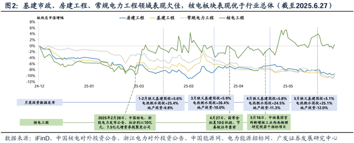具体而言,基建、房建、电力工程领域看:固投增速保持低位致使基建房建领域市场表现不佳,核电核准符合预期、聚变发展提速带动核电板块投资热度。根据iFinD,25M1-5,单月狭义基建固投保持5-6%,单月地产投资同比降幅保持10-12%。基建、地产投资面边际变化较少+化债进展及财政政策未超市场预期+传统基建房建市场总铁收窄背景下,年初以来房建、基建板块表现均弱于行业整体。电力工程方面,年初136号文出台促进国内新能源高质量可持续发展,推动发电企业由规模扩张转向高质量运营,短期对或对新能源投资造成压制,我们分析受该预期影响,常规电力工程板块表现弱于行业整体。核电方面,4月国常会批复核准10台核电机组,数量基本符合市场预期。核聚变发展提速,增资聚变公司多个聚变项目设备采购及工程招标,致使核电板块保持较好市场热度,表现强于行业整体。