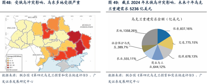 俄乌冲突已造成乌克兰农业、工业、基础设施严重受损。根据联合国《第四次乌克兰损害和需求快速评估》,未来10年,乌克兰重建预计需5236亿美元(截至2024年末俄乌冲突影响),涵盖住房、交通、能源等众多领域,为中国建筑企业带来广阔市场机遇。乌克兰总统泽连斯基2月23日下午在基辅举行记者招待会上提出“会给中国的企业重建乌克兰并以此盈利的可能性”,呈现较积极的合作态度。