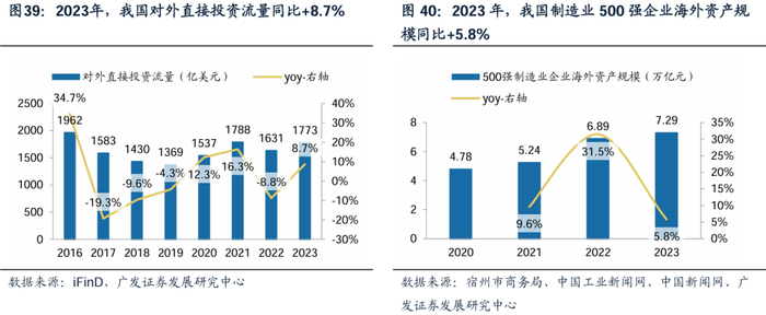 受美国关税政策影响,我国制造业海外产能扩张迅速。我国对外直接投资流量自2017年以来呈波动上升的趋势,2023年增至1773亿美元。其中2020年和2021年同比增幅最大,达到12.3%和16.3%。我国制造业企业持续扩张海外产能。比亚迪2017年在美国、摩洛哥等地投资建厂,2022年在泰国、乌兹别克斯坦等设厂。三一重工在印尼投资建设的“灯塔工厂”于2022年8月15日投产,生产的首台SY215CKD挖掘机下线。