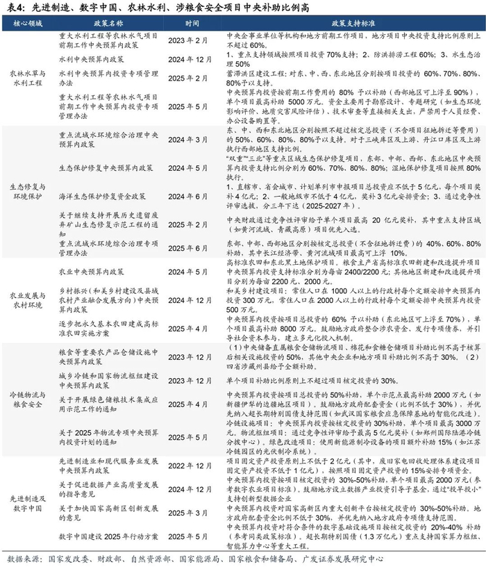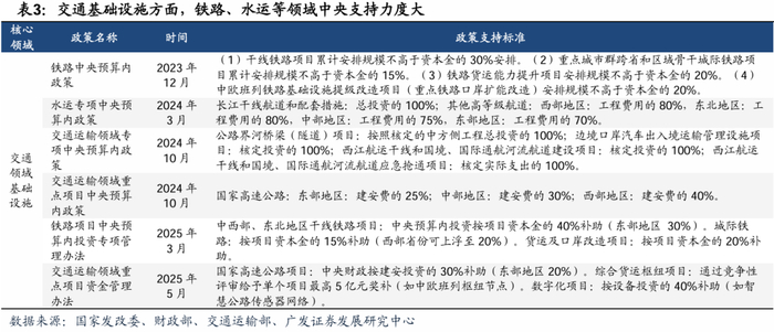 有效投资和产业科技投资端,铁路、水运交通基础设施,农林水利基础设施、消费基础设施支持力度大。(1)交通领域看,铁路、水运工程支持力度大,高速公路政策延续。铁路方面,根据国家发改委,按照铁路级别划分补助比例在15%-30%不等,中欧班列铁路基础设施提级改造项目(重点铁路口岸扩能改造)安排规模不高于资本金的20%;水运方面,根据国家发展改革委发布《关于印发<水运中央预算内投资专项管理办法>的通知》,高等级航道及配套工程中央补助比例高达70%-100%;根据财政部,国家高速公路中央补贴比例达25%-40%,交通基础设施支持力度大。(2)农林水利领域看,水利工程支持力度大,根据国家发展改革委发布《关于印发<水利中央预算内投资专项管理办法>的通知》,重点支持领域按照项目投资的70%予以支持;重点流域治理最高补贴比例达80%;农业方面,根据国家发改委,粮食主产省高标准农田新建和改造支持额度标准分别为每亩2400/2200元,中央储备直属粮食仓储物流项目补贴比例最高达50%。(3)科技领域看,数据产业项目支持“投早投小”,根据国家发改委,中央预算内投资按项目核定投资的30%-50%补助,单个项目最高2000万元;对符合条件的数字基础设施项目按核定投资的20%-40%补助,超长期特别国债重点支持国家算力枢纽、智能算力中心等重大工程。