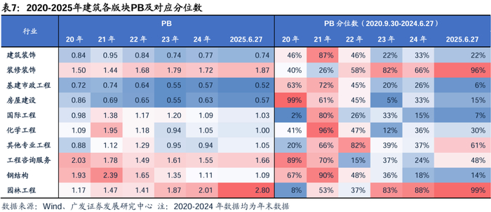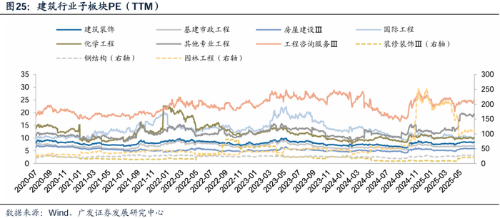 估值端:年初至6月中旬,建筑行业PE估值略有提升,PB估值基本保持不变。根据Wind,25M1-3,市场风格偏向小盘股,建筑装饰板块估值水平相对稳定;25M4,受建筑行业公司2024年及25Q1业绩表现不佳影响,PE估值略有提升,PB估值基从本保持不变。核心细分子行业看,截至6月20日(分位数为过去五年水平),基建(7.1xPE/50%分位,0.50xPB/2%分位)、房建(7.1xPE/88%分位,0.56xPB/8%分位)、国际工程(9.4xPE/6%分位,0.96xPB/1%分位)、工程咨询(26.9xPE/99%分位,1.58xPB/27%分位)及钢结构(23.3xPE/75%分位,1.05xPB/9%分位)。整体看,2025年上半年小盘股表现较优,工程咨询等板块受到资产注入、并购等非基本面事件影响,估值提升。