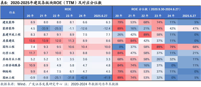 分位数看:根据Wind,6月27日,建筑装饰5年ROE(TTM)/PB分位数5%/22%,均位于历史低点。其中房建、基建ROE处于近5年较低水平,PB亦属于历史较低水平。装修装饰、其他专业工程、工程咨询服务、化学工程、装修装饰ROE及PB相较行业总体处于较高水平。国际工程ROE相较行业整体处于较高水平,PB分位数处于历史较低水平。