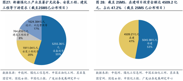 新疆煤化工投资力度突出,在建及待建项目投资额达9555亿元。根据中国拟在建网,25Q1,国内煤化工共有10个超过百亿的大体量项目,其中9个均位于新疆。其中4个项目投资额超过300亿元,均位于新疆。根据外发煤化工专题报告统计,新疆在建及待建的煤化工项目对应投资额合计约9555亿元。根据中能网数据,煤化工投资中设备占55%,安装工程大约占20%,建筑工程大约占8%,其余为设计、建设期利息费用等。将项目总额与相应比例相乘,计算得新疆煤化工产业发展分别带动设备投资额/安装工程投资额/建筑工程投资额5255.4/1911.0亿元/764.4亿元。从项目执行情况看,在建项目投资金额达4509亿元,占比47.2%。