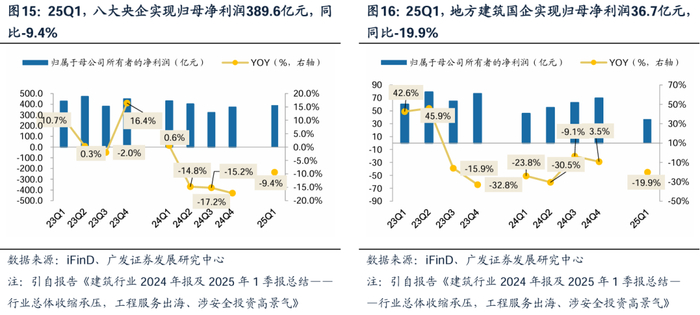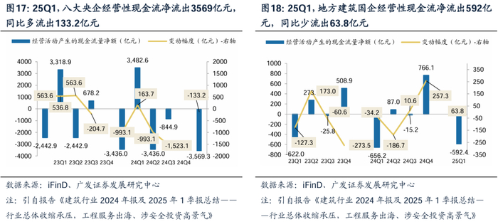 企业端看,建筑主流央国企经营压力不减、现金流同比进一步承压。当前看,受限于地方财政,建筑工程企业均表现承压。业绩端,25年建筑央国企仍持续承压,根据iFinD,25Q1,八大建筑央企/地方建筑国企分别实现归母净利润389.6/36.7亿元,分别同比-9.4%/-19.9%。现金流剪刀差持续,25Q1,八大建筑央企/地方建筑国企经营现金分别净流出3569/592.4亿元,分别同比-133.2/63.8亿元。